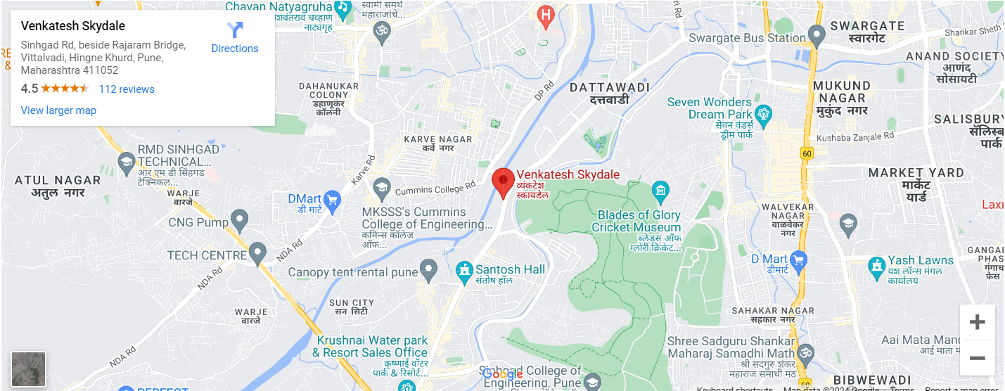 Welcome to Venkatesh Skydale, an epitome of luxury nestled along Sinhgad Road, near Rajaram Bridge, brought to you by Venkatesh Buildcon Pvt Ltd. Skydale stands as a gated community project, offering breathtaking vistas of Taljai Hills and the serene Riverview, promising an unparalleled living experience for its residents. Discover the essence of luxurious living in this vibrant housing society.